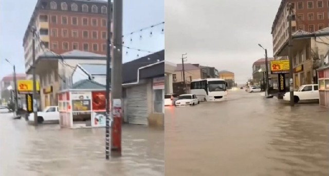Yayılan görntelərdə suyun səviyyəsinin qalxması ilə əlaqədar avtomobillərin hərəkət etməkdə çətinlik çəkməsi öz əksini tapıb.